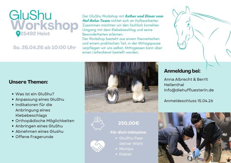 Übe mit uns in der Praxis, mit deinem Werkzeug > was du brauchst um proffessionell zu kleben. Wie du Glushu anpasst und wie vielseitig sie einsetzbar sind. Nutze unsere Erfahrung für deinen Erfolg am Huf.
